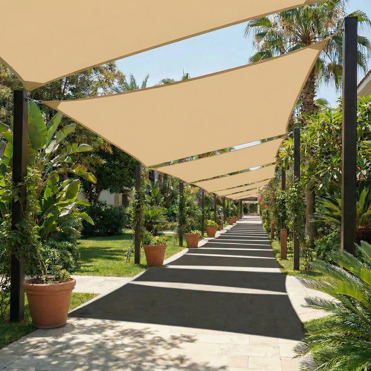Our sun shade sail can be secured to existing structures like walls and roofs, provided they can withstand the sail's pulling force. Alternatively, you can use dedicated support poles and hardwares designed to be strategically positioned and highly durable.